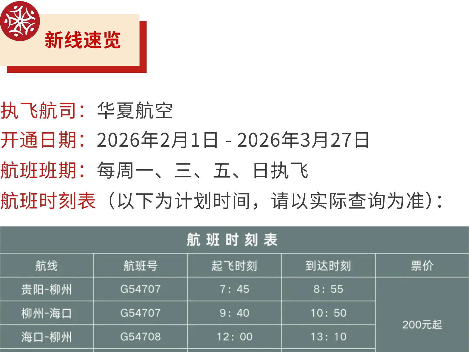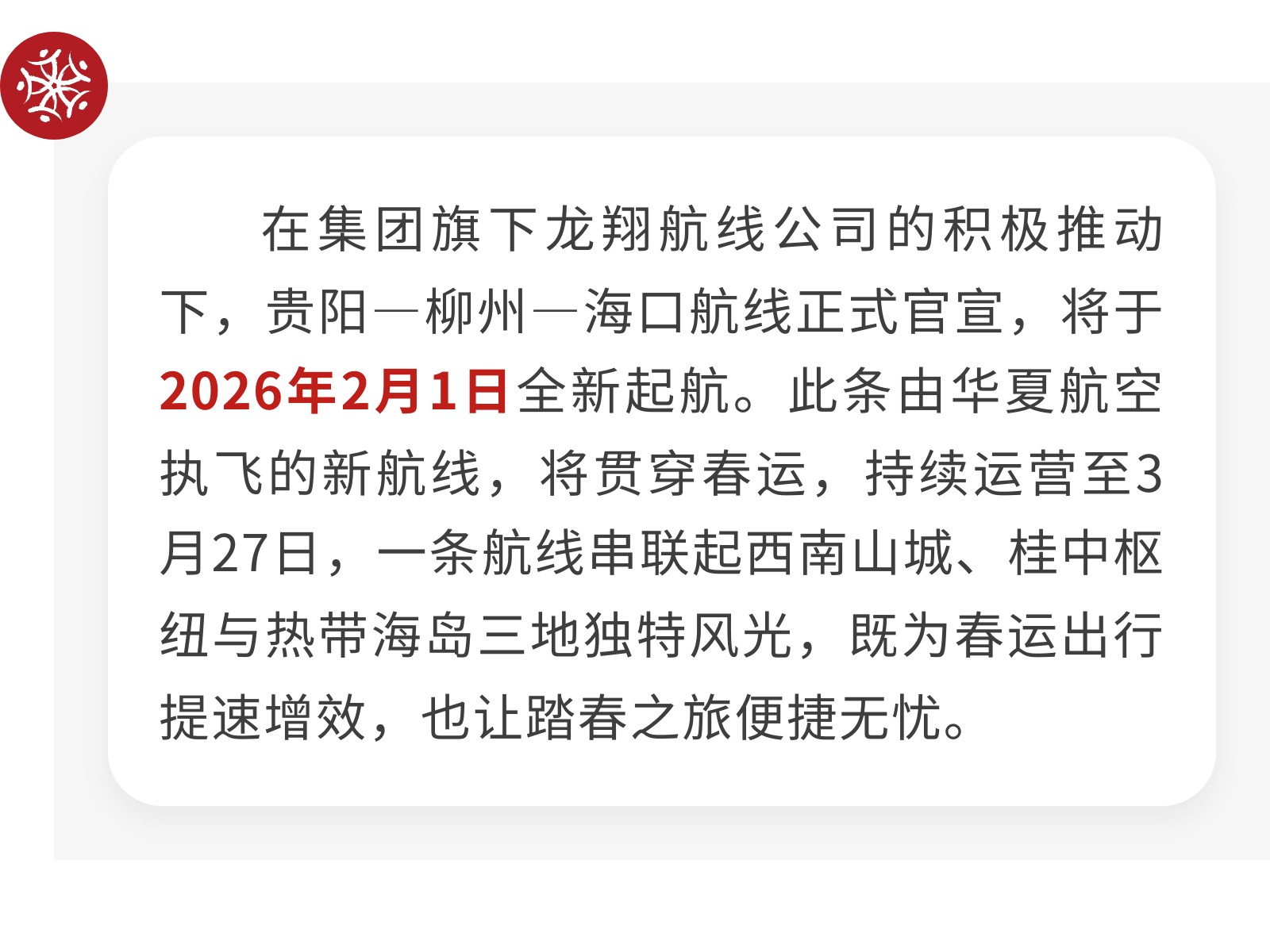 新春添新翼!龍翔航線公司成功開通貴陽—柳州—海口新通道 發(fā)布時(shí)間:2026年01月15日 14時(shí)來源:本站原創(chuàng)瀏覽:42 人次