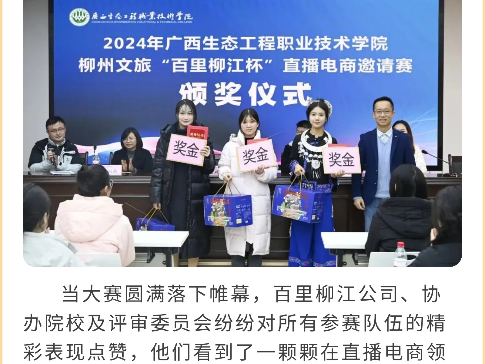 高校聯(lián)合競(jìng)賽,共筑電商夢(mèng)想?——2024年廣西生態(tài)工程職業(yè)技術(shù)學(xué)院柳州文旅“百里柳江杯”直播電商邀請(qǐng)賽圓滿落幕 發(fā)布時(shí)間:2025年01月02日 18時(shí)來源:本站原創(chuàng)瀏覽:240 人次