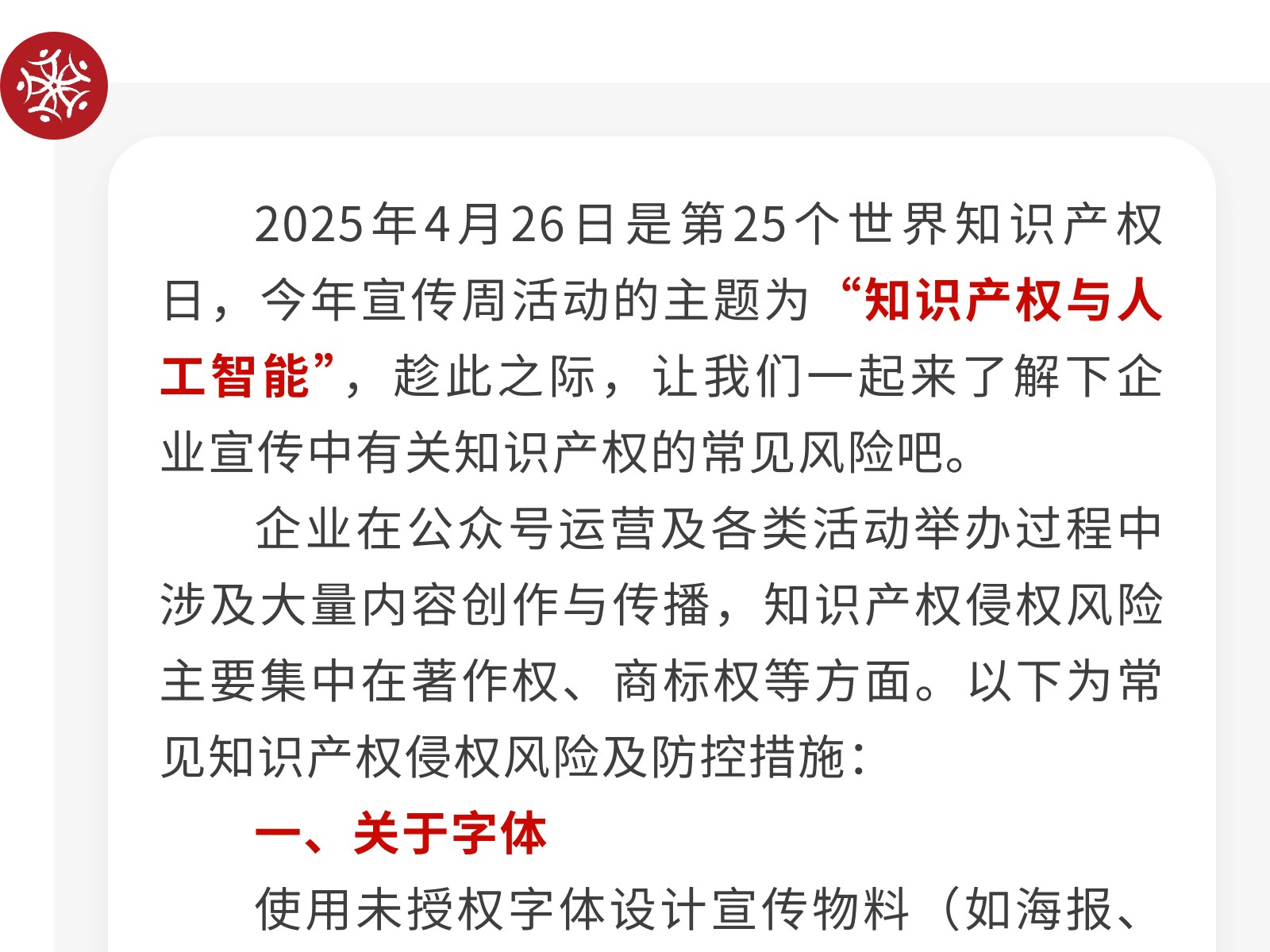 【全國知識產(chǎn)權(quán)宣傳周】提高知識產(chǎn)權(quán)意識,守住企業(yè)合規(guī)底線 發(fā)布時間:2025年04月28日 16時來源:本站原創(chuàng)瀏覽:248 人次