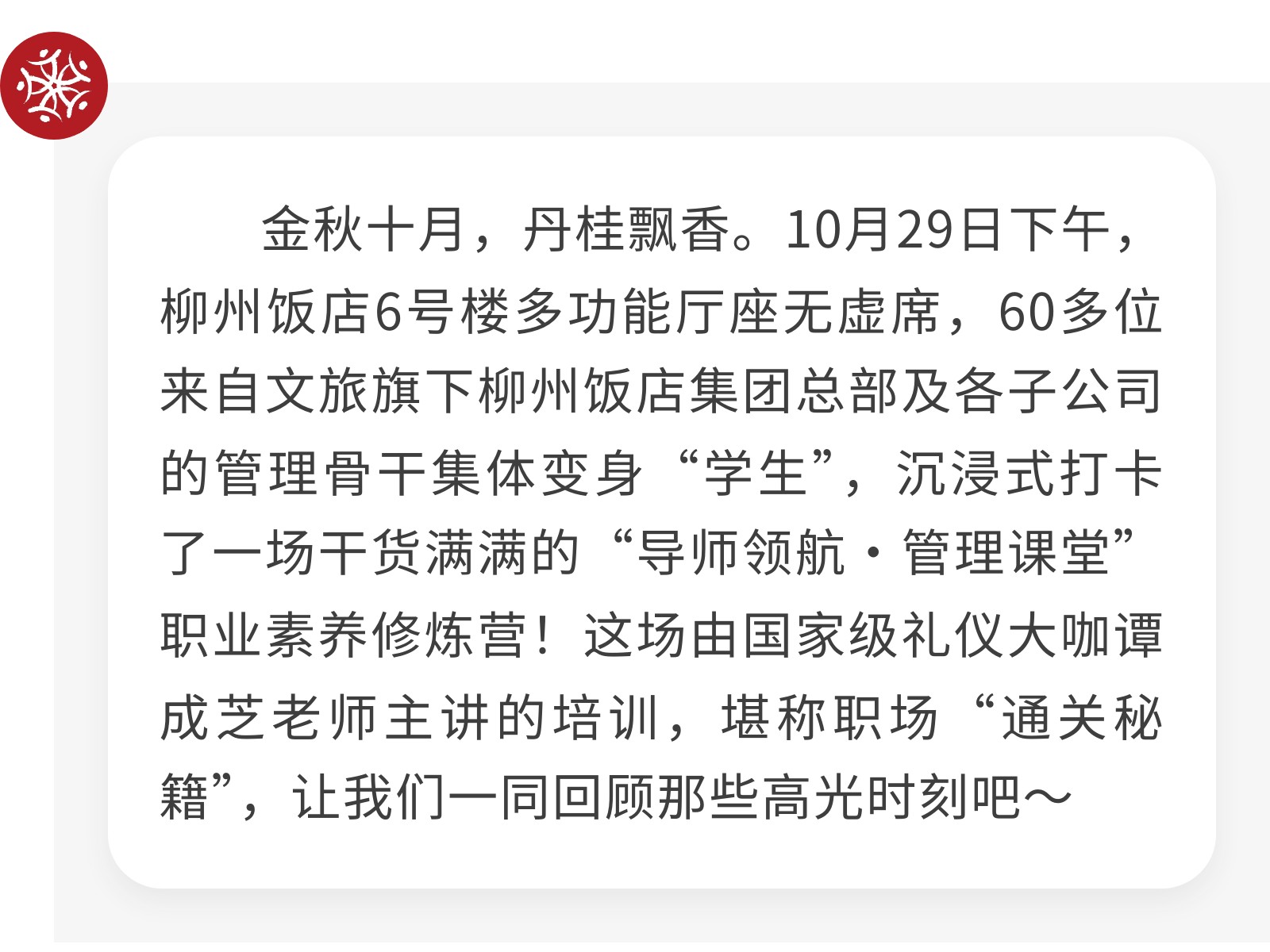柳州飯店集團“導師領航·管理課堂”職業素養修煉營圓滿舉辦 發布時間:2025年10月31日 10時來源:本站原創瀏覽:33 人次