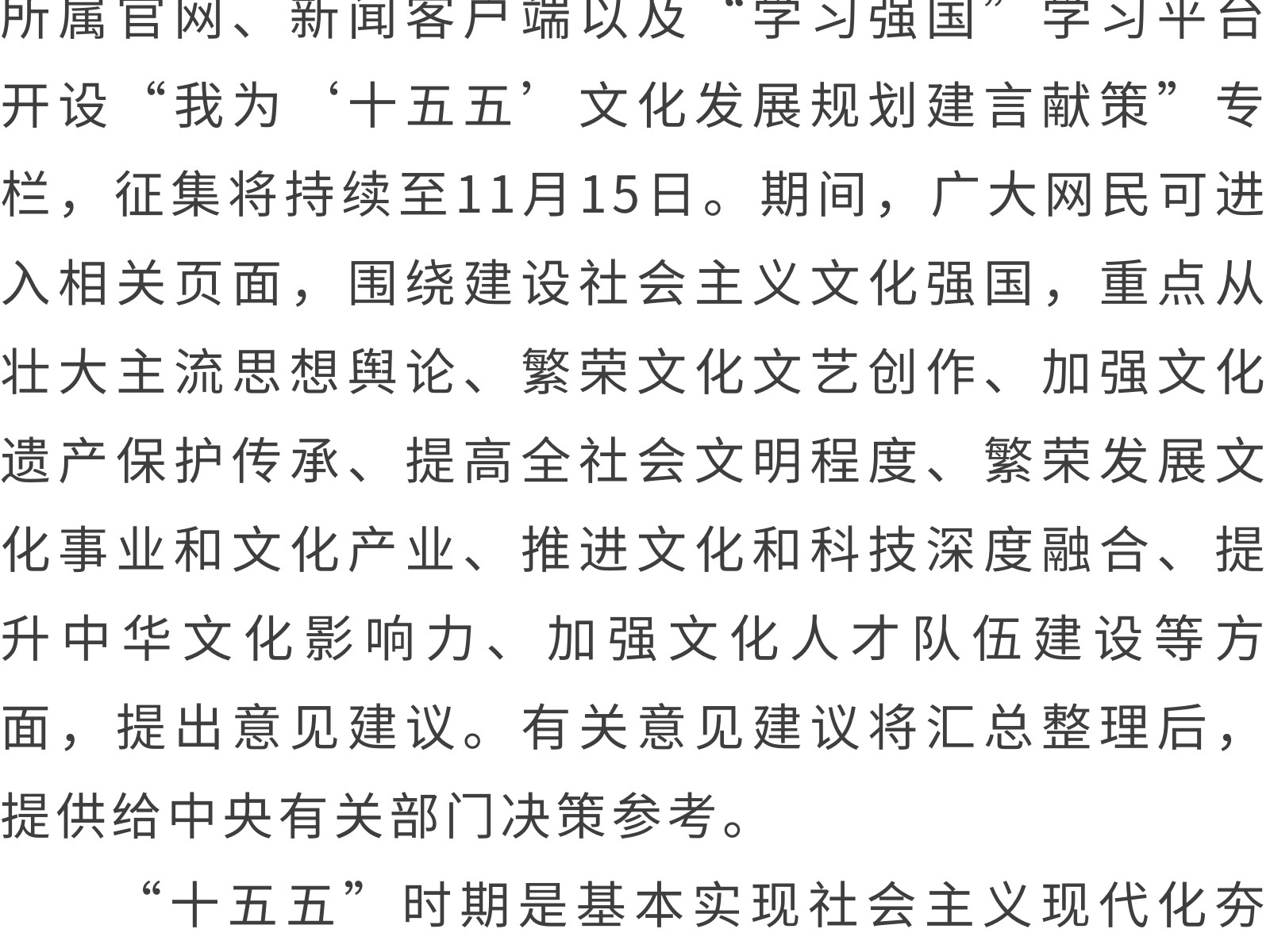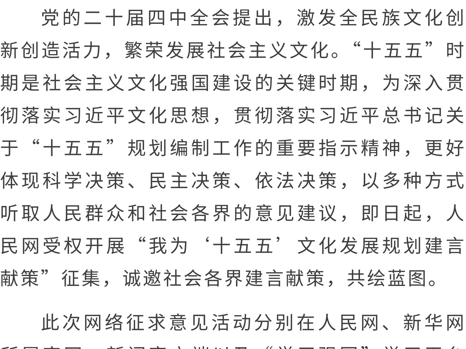 “十五五”文化發展規劃編制工作開展網絡征求意見活動 發布時間:2025年11月11日 11時來源:本站原創瀏覽:15 人次