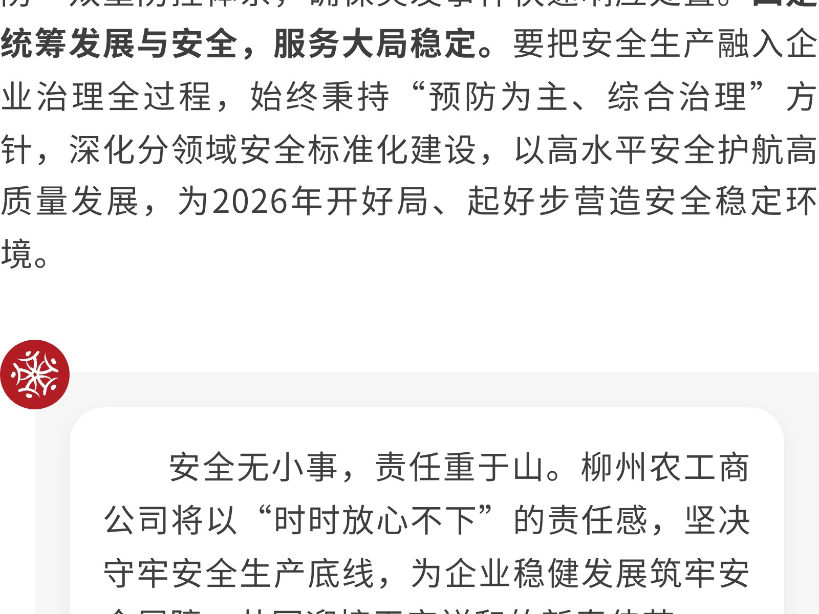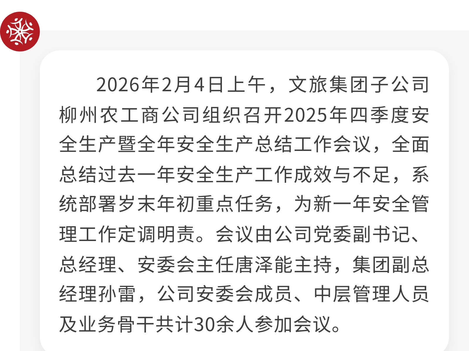 壓緊責任鏈條,筑牢歲末年初安全防線——柳州農工商公司召開2025年度安全生產總結會 發布時間:2026年02月06日 12時來源:本站原創瀏覽:62 人次