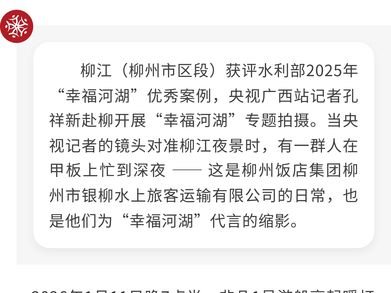 央視鏡頭柳江美,銀柳水上暖心扉 發布時間:2026年02月06日 13時來源:本站原創瀏覽:56 人次