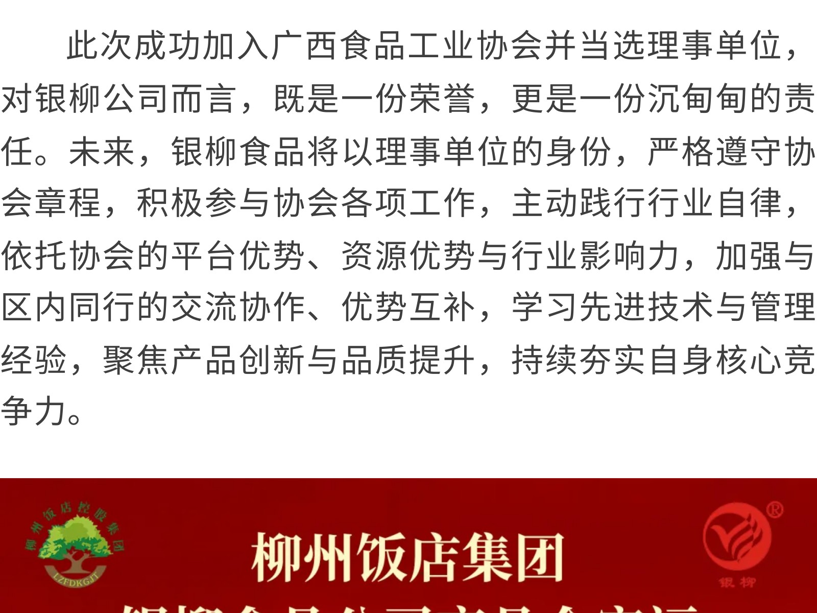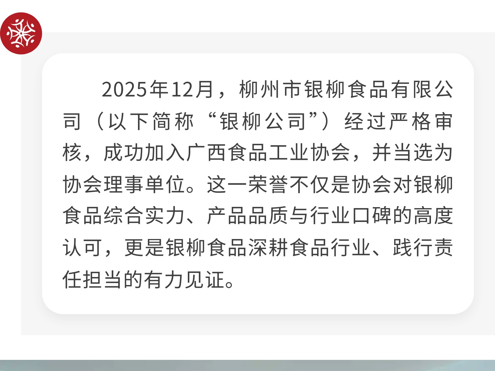 凝心聚力啟新程、勇擔使命向未來——柳州市銀柳食品有限公司當選廣西食品工業協會理事單位 發布時間:2026年02月25日 15時來源:本站原創瀏覽:15 人次