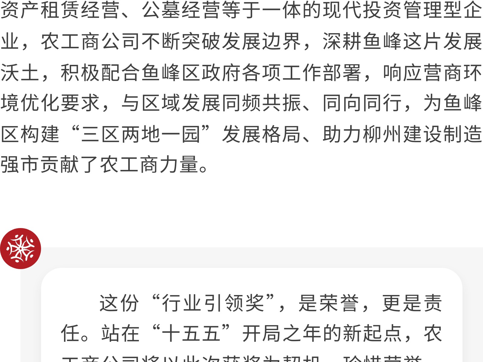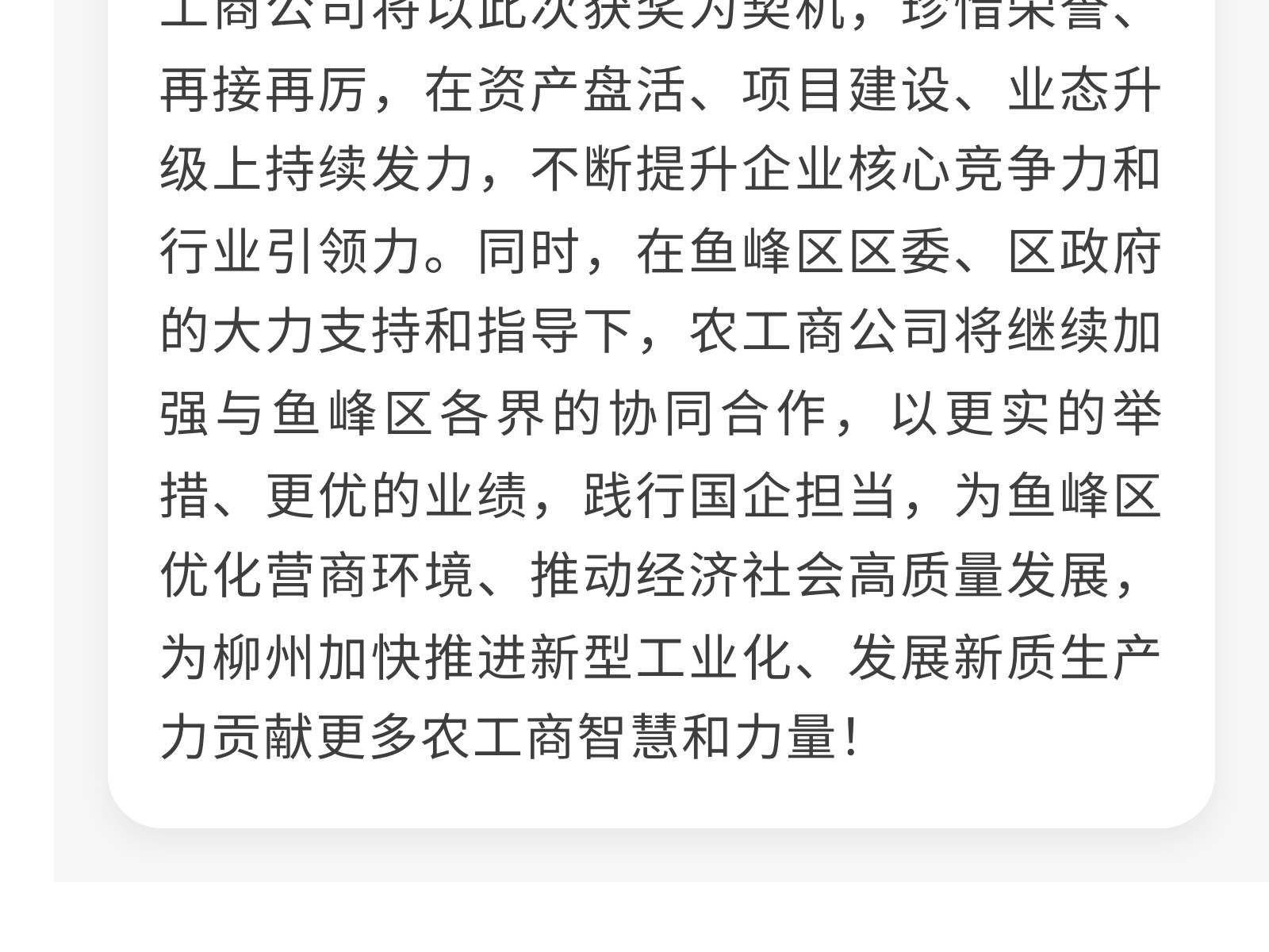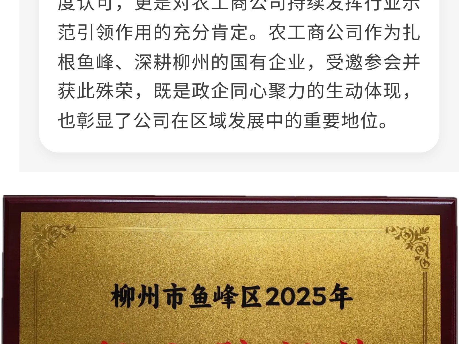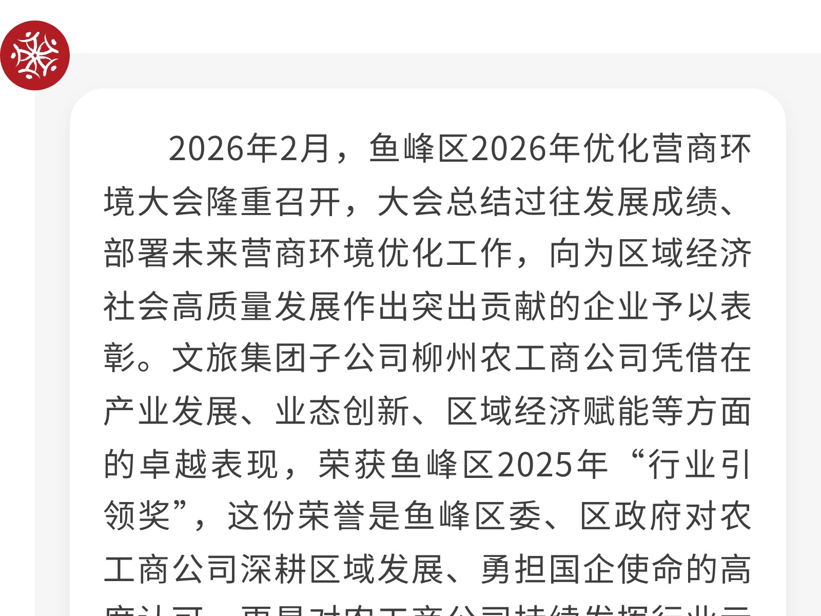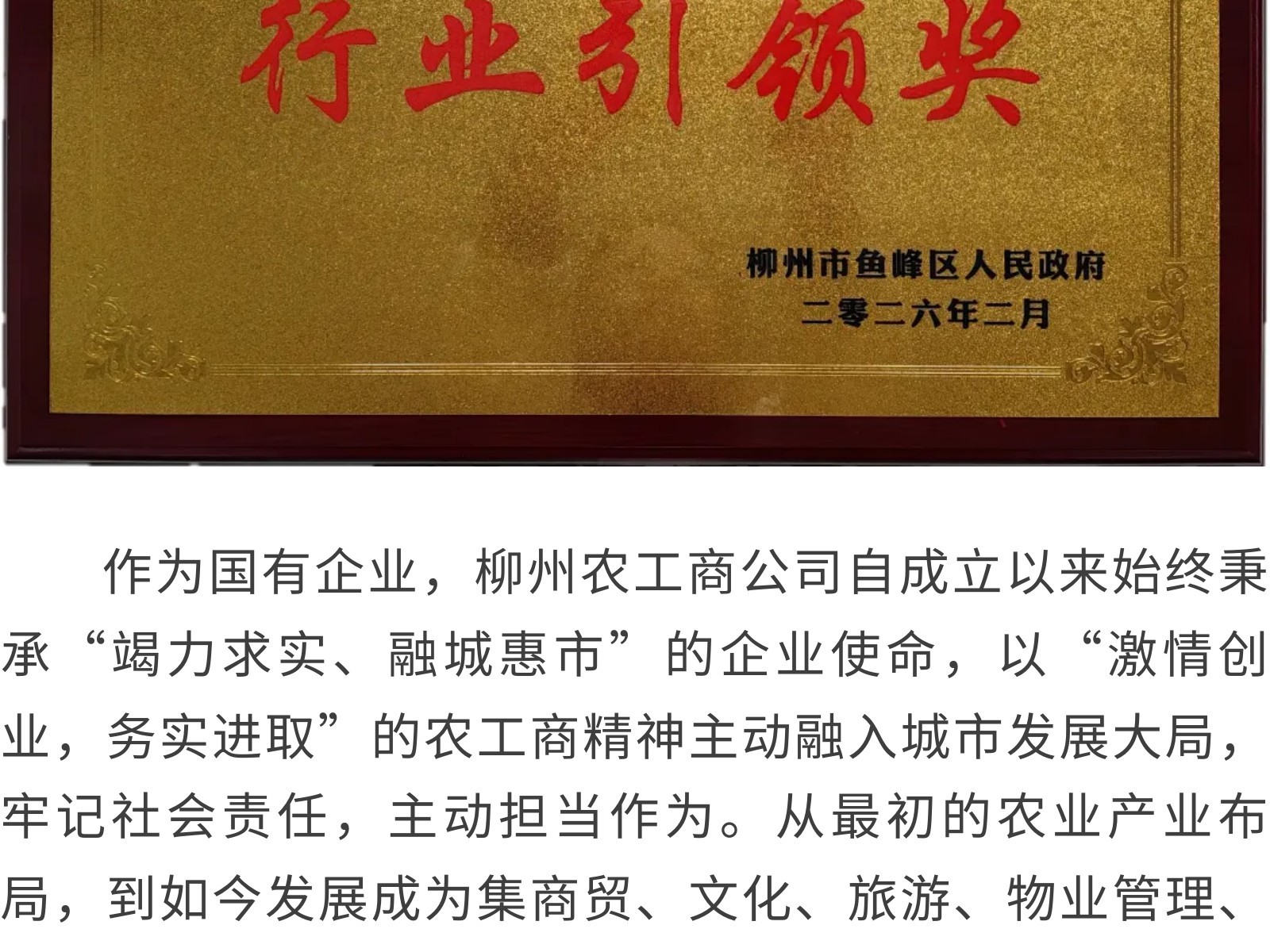 喜獲殊榮!柳州農工商公司榮膺魚峰區“行業引領獎” 發布時間:2026年03月05日 10時來源:本站原創瀏覽:71 人次