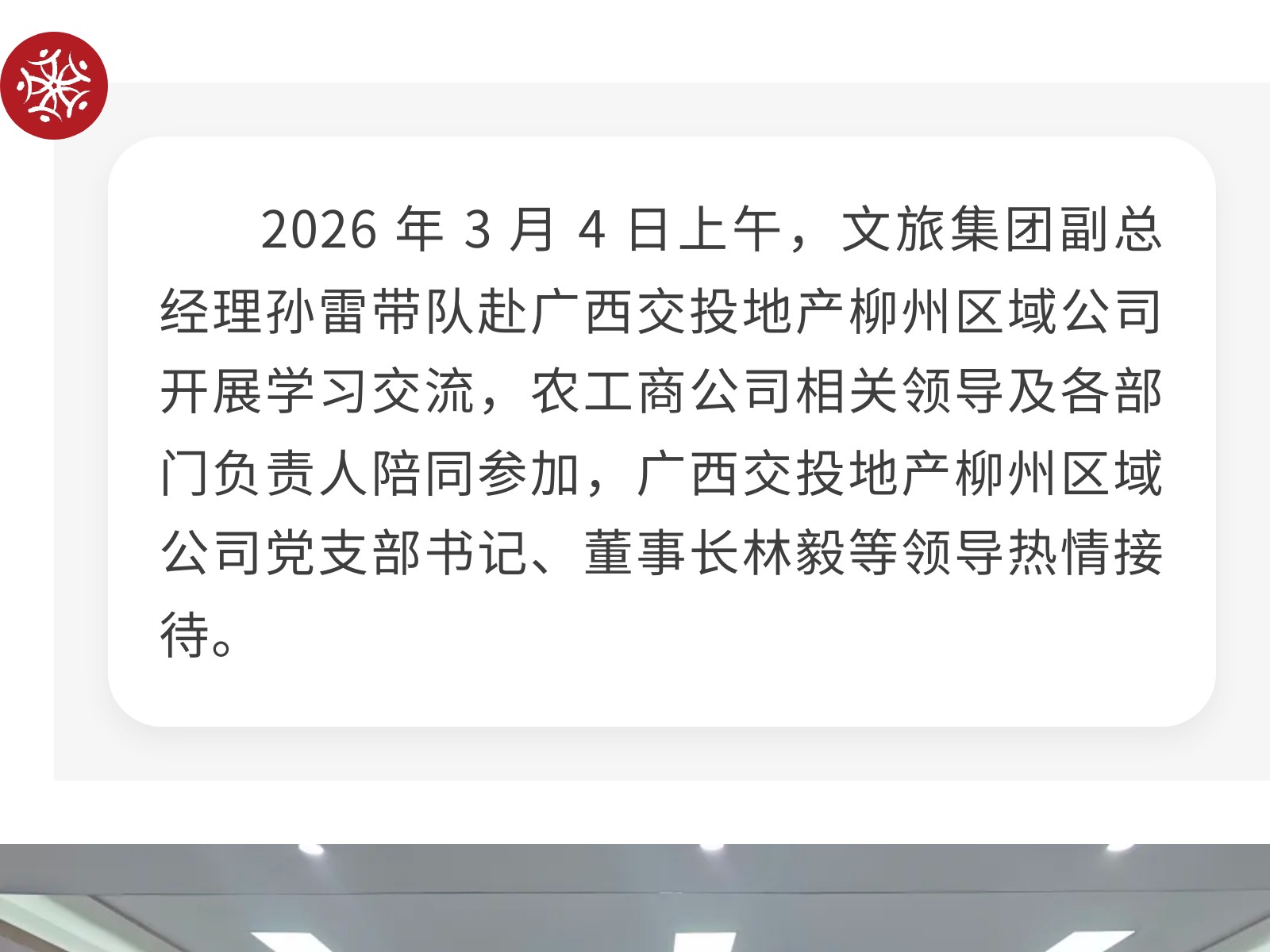 深化交流謀合作 攜手共贏促新局——文旅集團(tuán)副總經(jīng)理孫雷帶隊(duì)到廣西交投地產(chǎn)柳州區(qū)域公司開展學(xué)習(xí)交流 發(fā)布時(shí)間:2026年03月10日 09時(shí)來源:本站原創(chuàng)瀏覽:57 人次