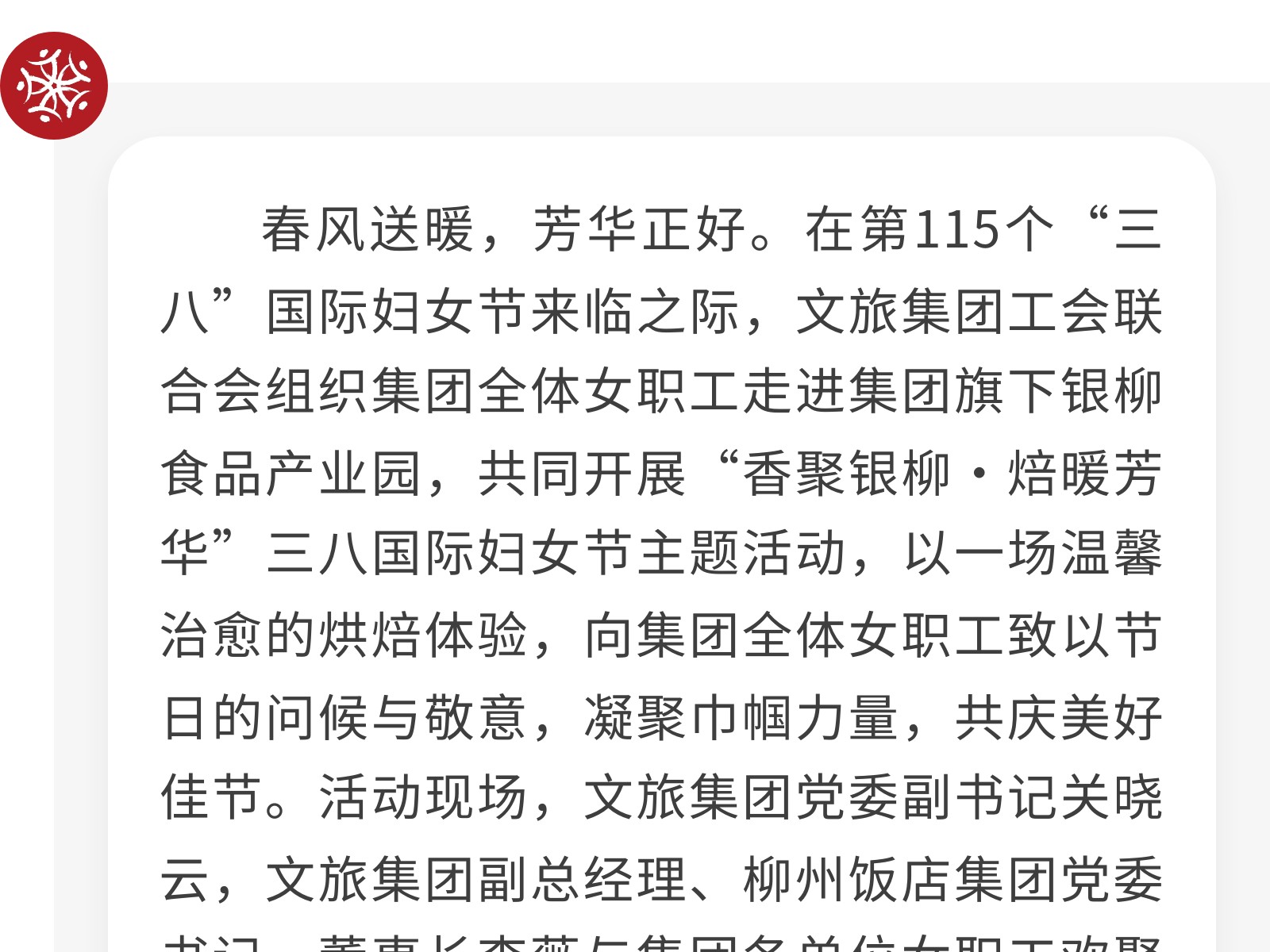 香聚銀柳·焙暖芳華——文旅集團(tuán)工會(huì)聯(lián)合會(huì)三八節(jié)主題活動(dòng)在銀柳食品溫情舉辦 發(fā)布時(shí)間:2026年03月11日 09時(shí)來源:本站原創(chuàng)瀏覽:61 人次