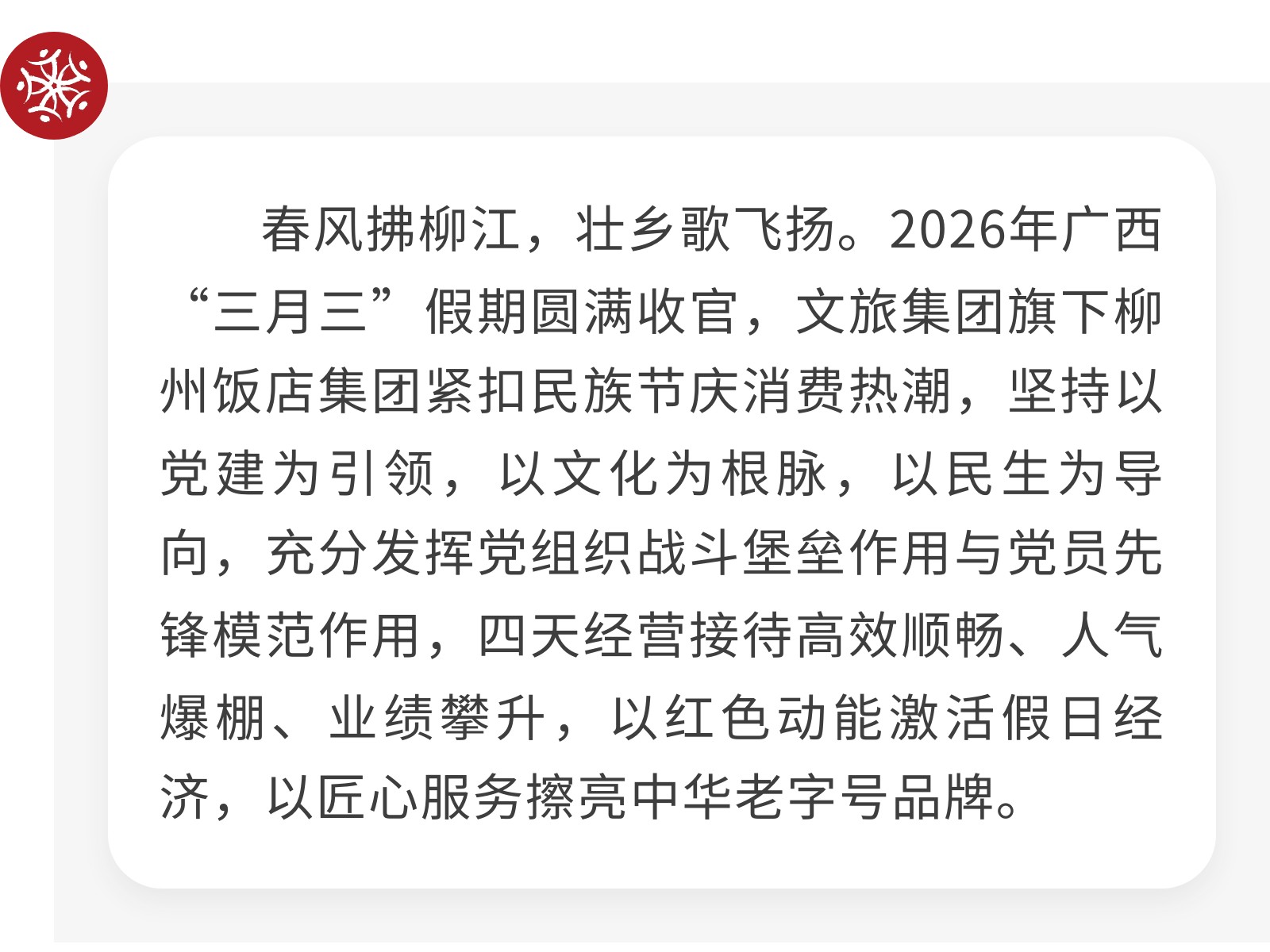 【春暖三月三 文旅煥新顏】柳州飯店集團(tuán)4天交出亮眼成績(jī)單 發(fā)布時(shí)間:2026年04月25日 16時(shí)來源:本站原創(chuàng)瀏覽:6 人次