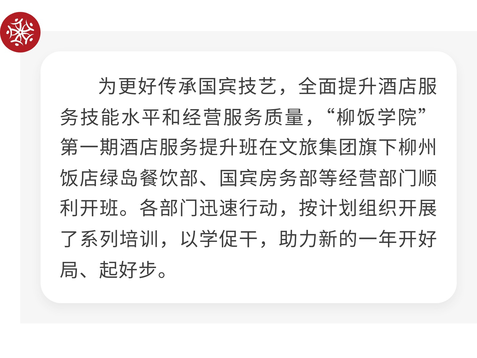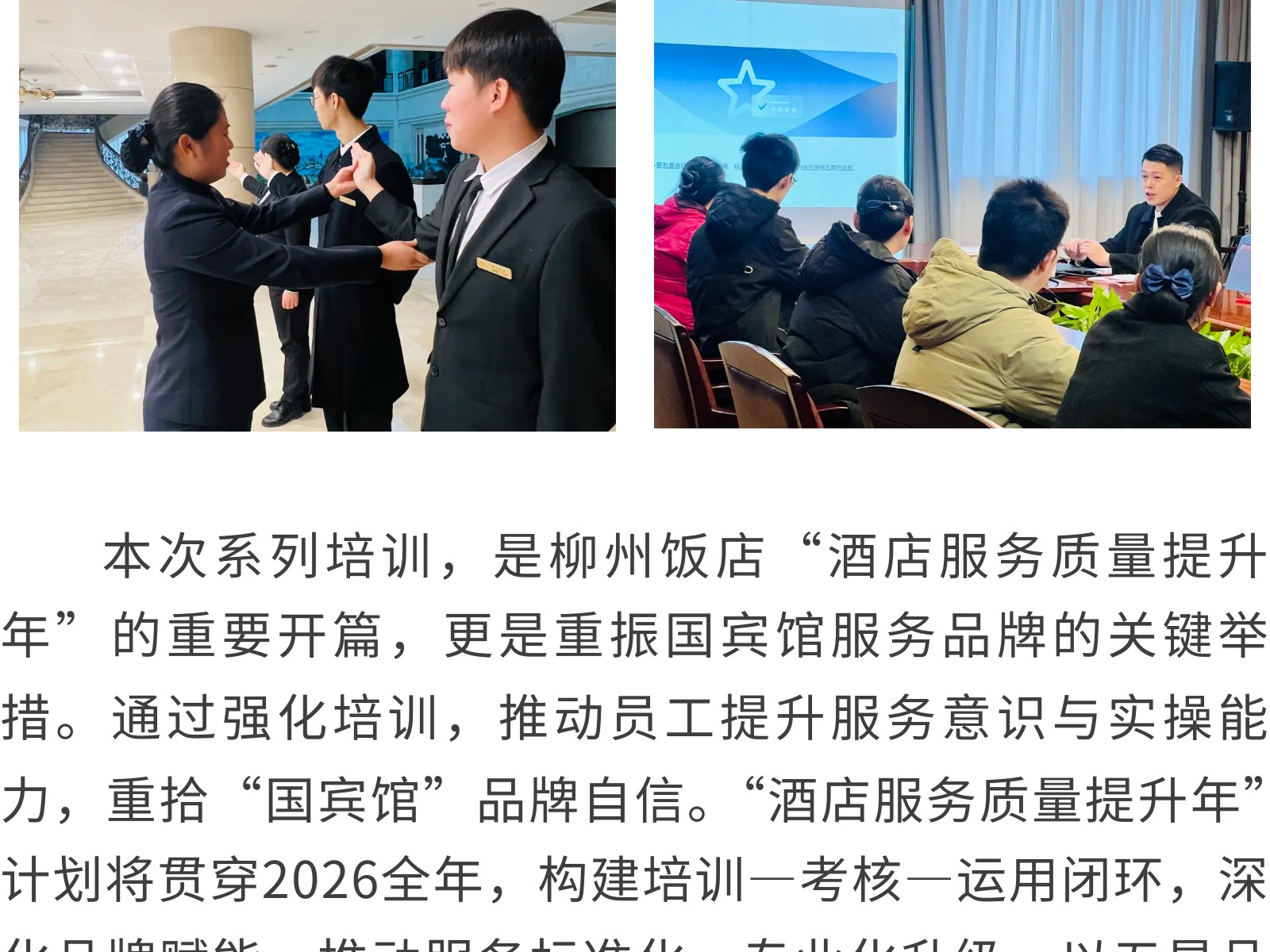 “柳飯學院”重磅啟班——首期酒店服務提升班開課 以學促干鑄服務標桿 發(fā)布時間:2026年02月13日 13時來源:本站原創(chuàng)瀏覽:17 人次
